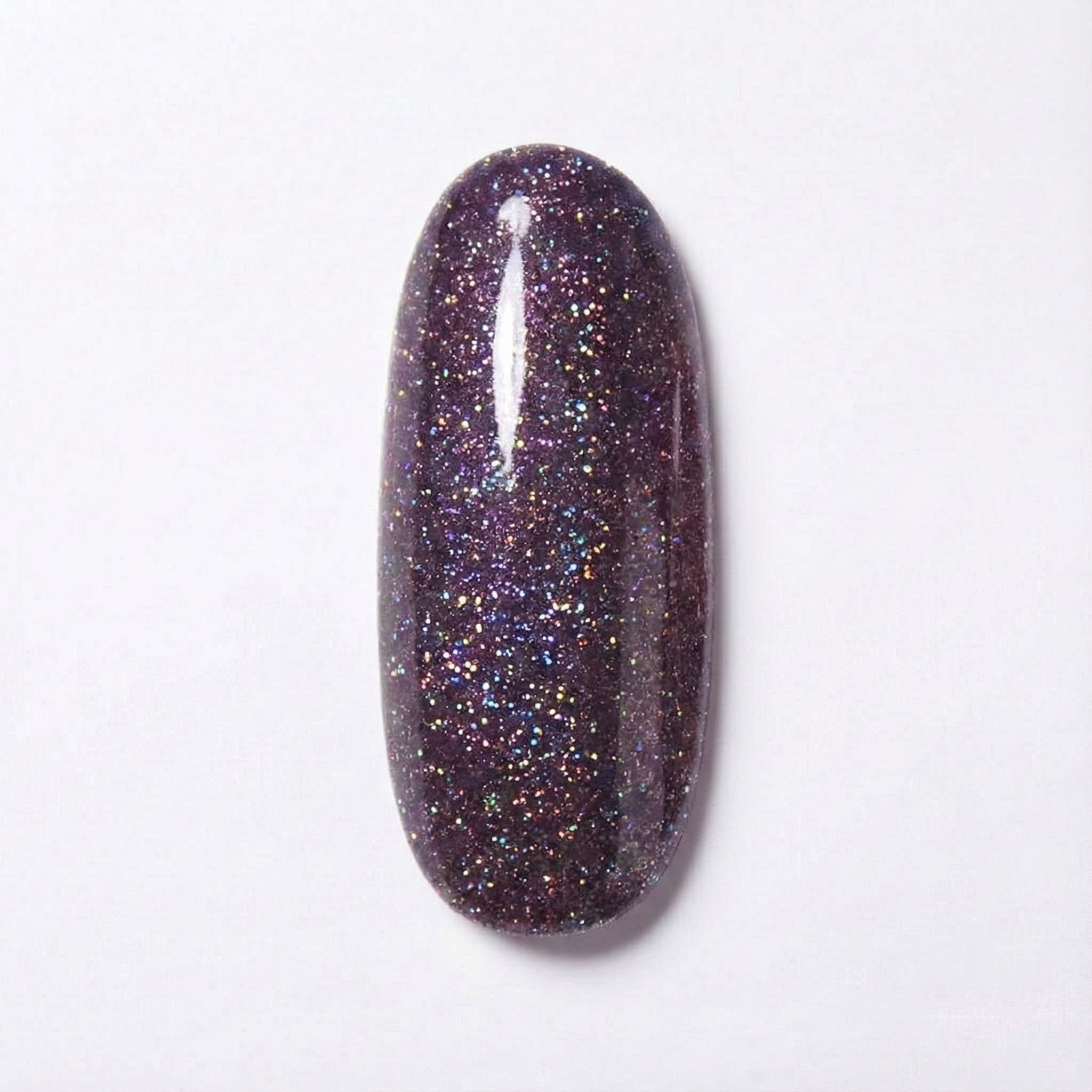 This shade sits between blackened berry and dark eggplant, with a strong plum influence. Throughout the base, tightly packed reflective shimmer produces multicolored sparks that resemble a compact starfield. The warm core color prevents the depth from feeling harsh, giving the dark tone a smooth, berry-like quality.