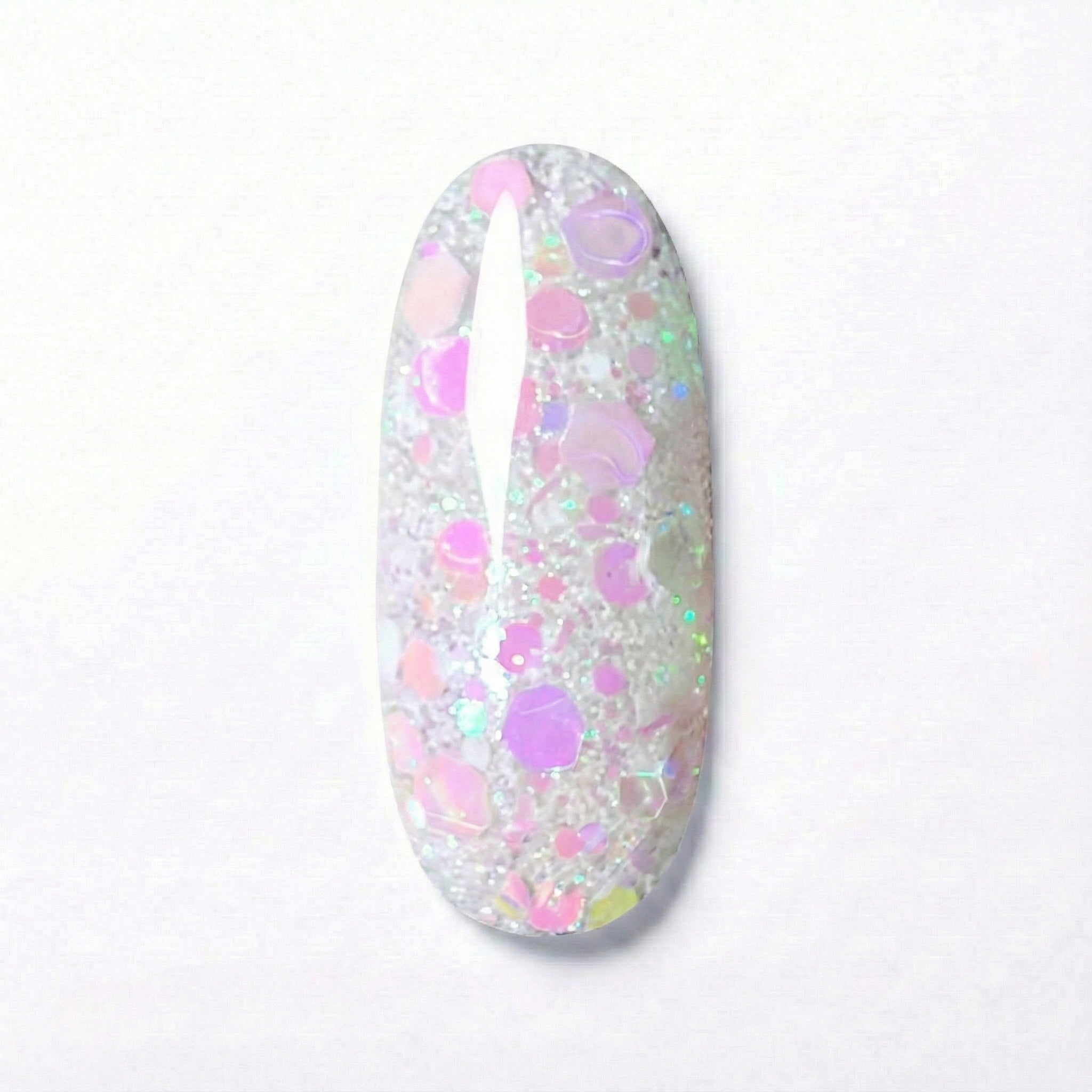 Un polvo de brillo grueso que presenta la pureza del blanco nieve o el coco adornado con delicados toques de rosa suave. Crea uñas que irradian sofisticación atemporal y un encanto sutil.