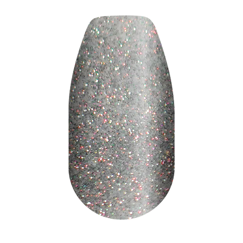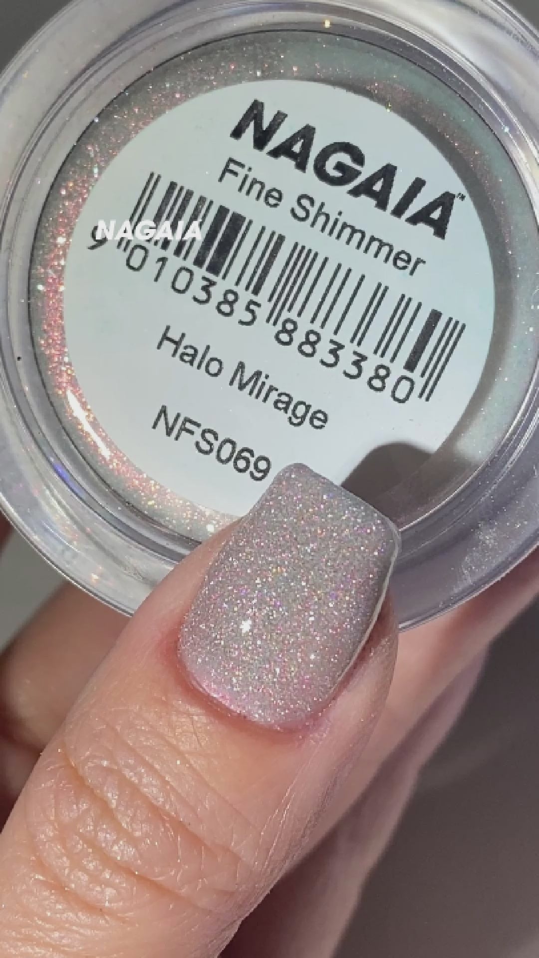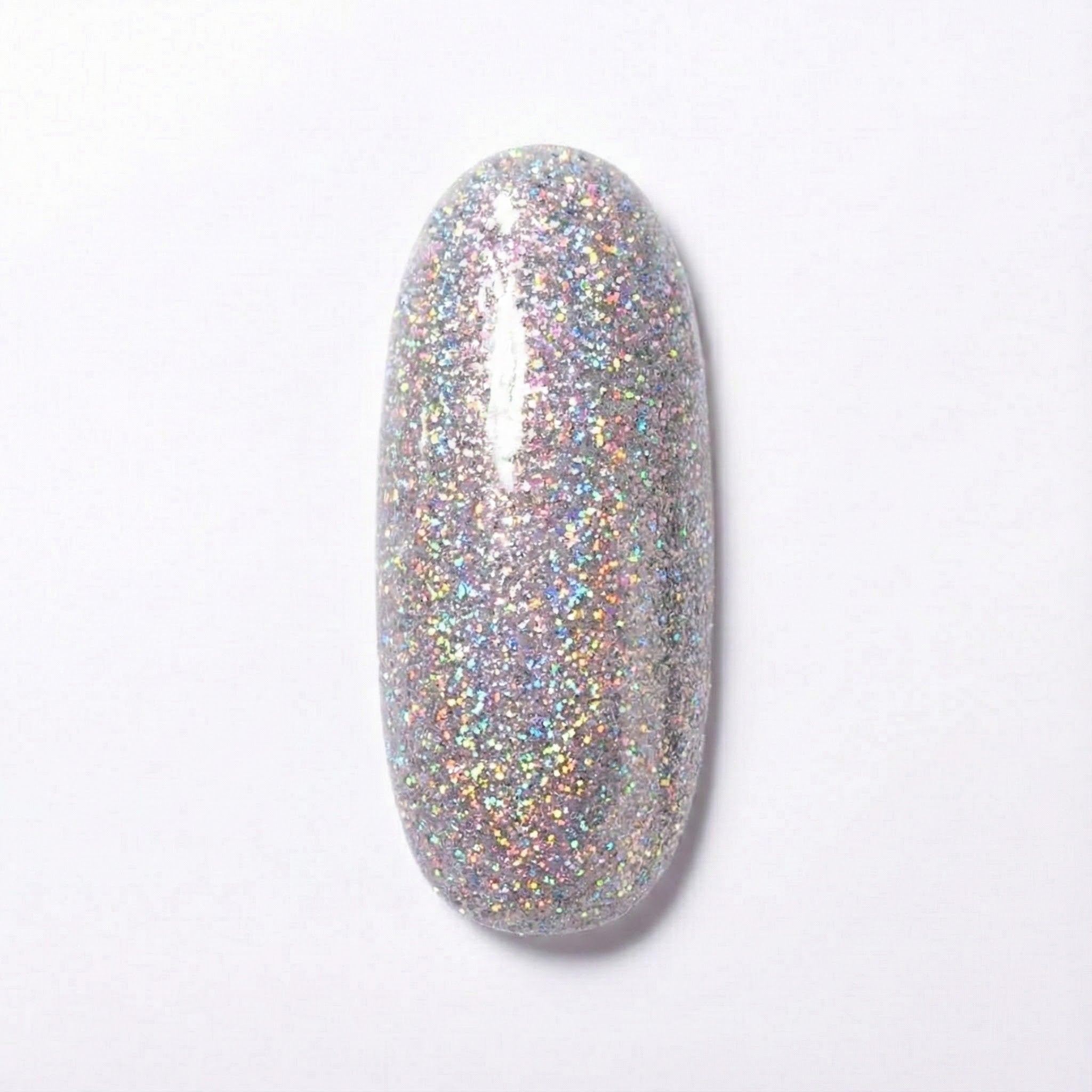 A mid-light silver scattered with ultra-fine particles that refract light into a pink–green gradient. The base remains clearly metallic, but the surface reflections introduce a halo effect where soft pink edges fade into subtle green highlights. The result is a controlled, mirage-like color shift that stays refined rather than high-contrast or neon.