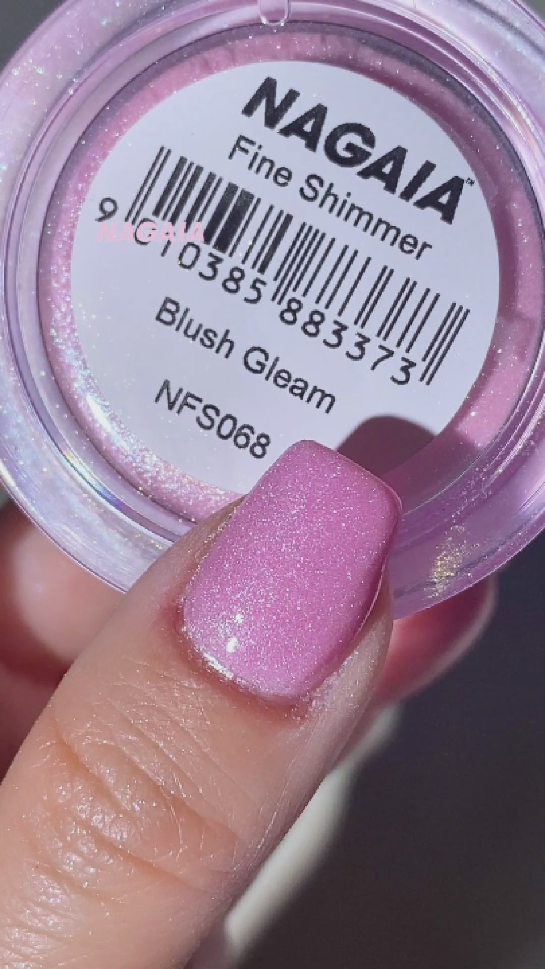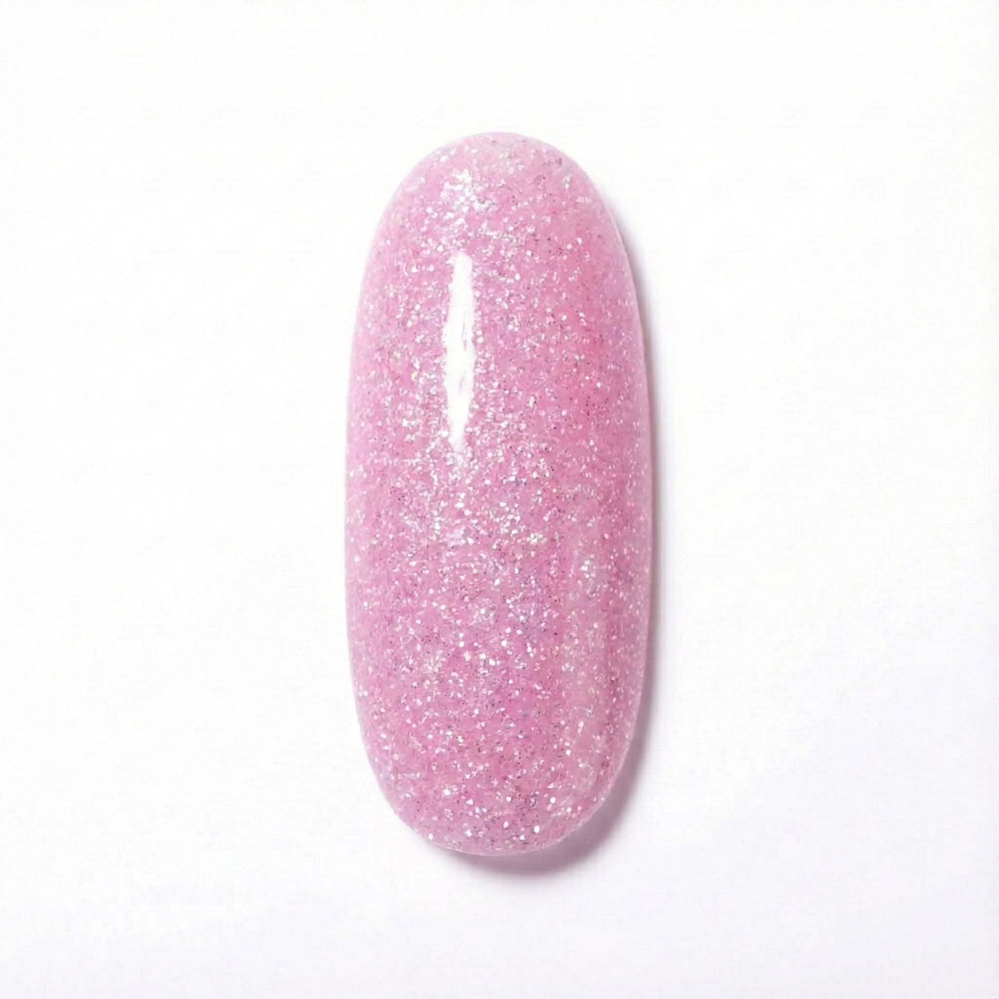 A gentle blush pink with clear warm undertones, sitting between rose and soft coral. The color is light enough to feel airy, but not pastel-faded. Ultra-fine iridescent particles are scattered through the base, adding a controlled, crystal-like twinkle that shows hints of pink, gold, and soft violet when the light shifts.