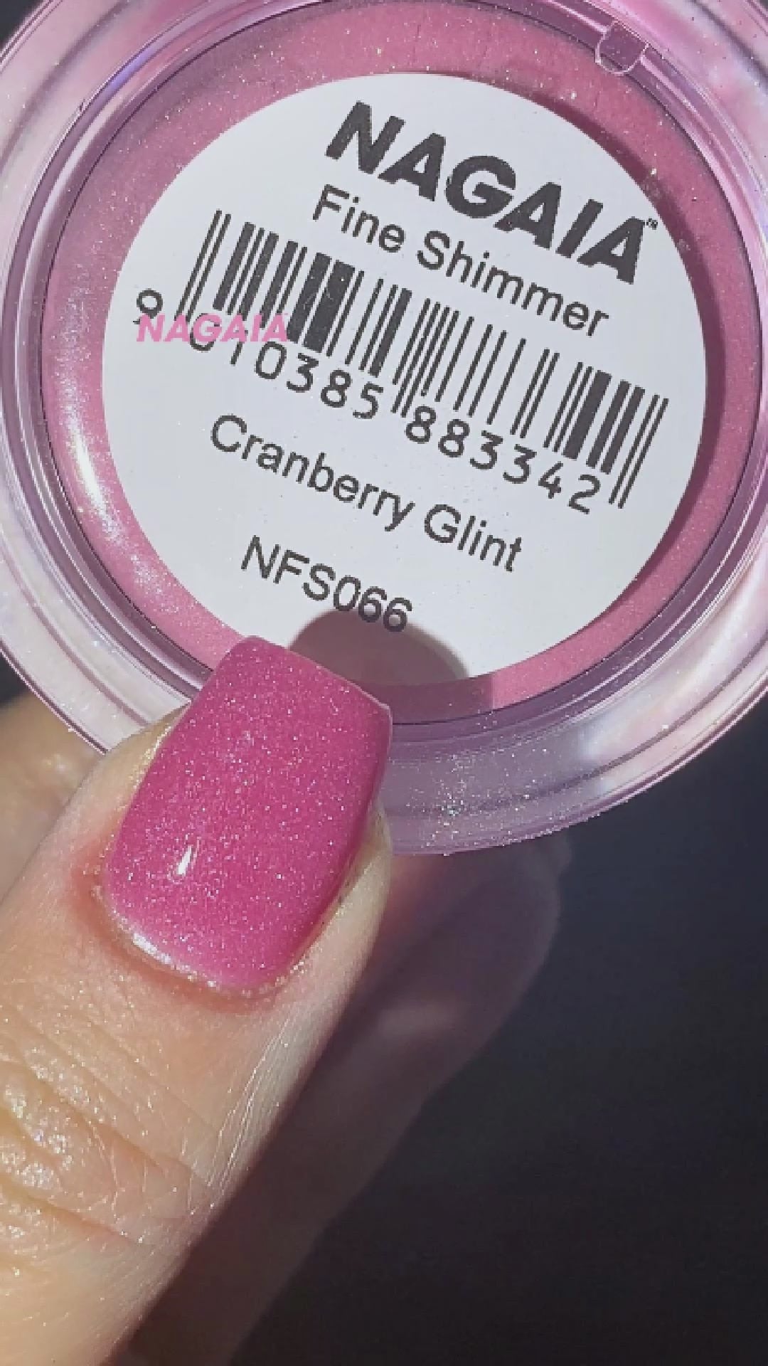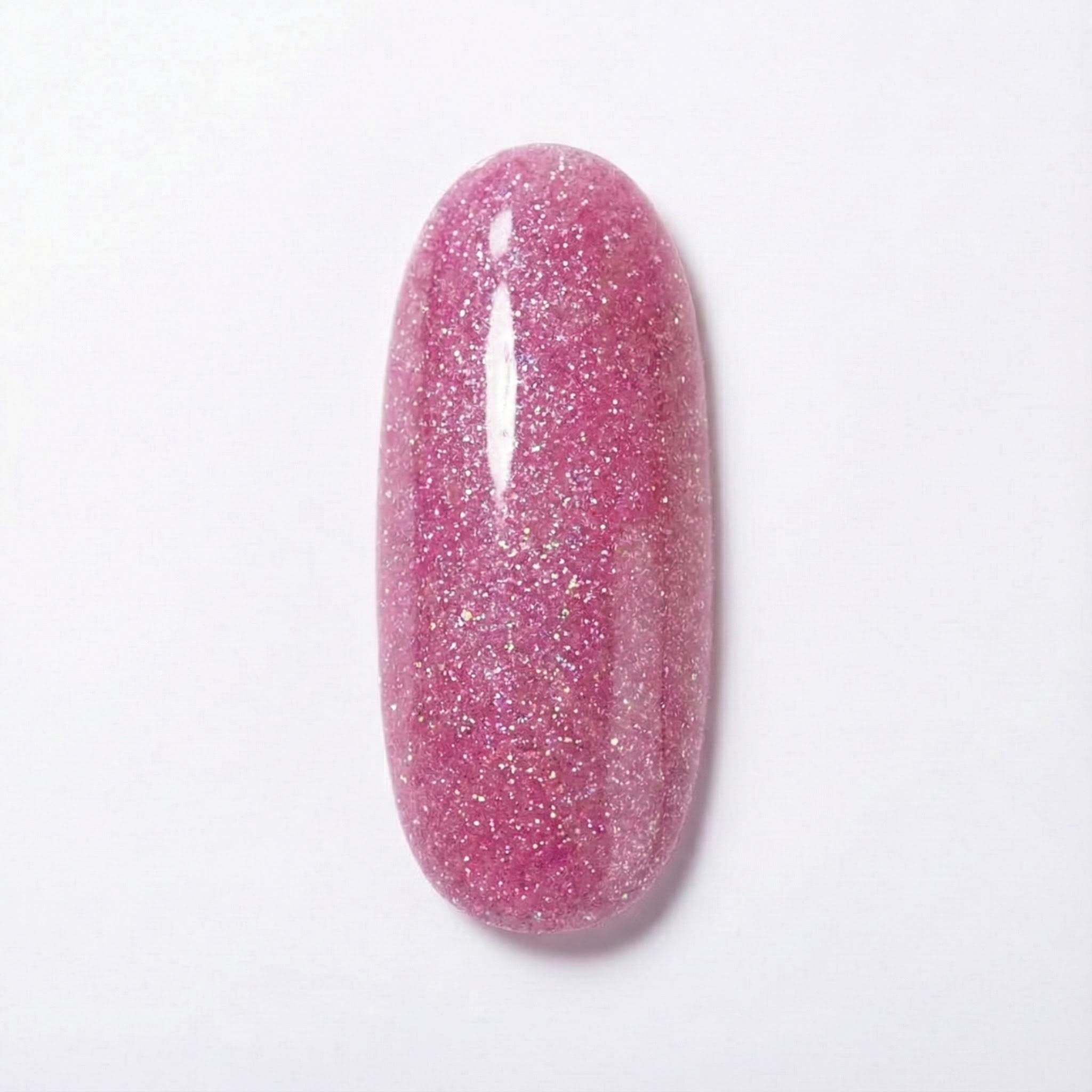 A mid-deep cranberry pink with gently warmed red undertones. The base color is even and opaque, while embedded shimmer particles create countless small points of reflection. In lower light, these catch and return light like tiny facets, giving a glinting effect that enhances the berry tone rather than competing with it.